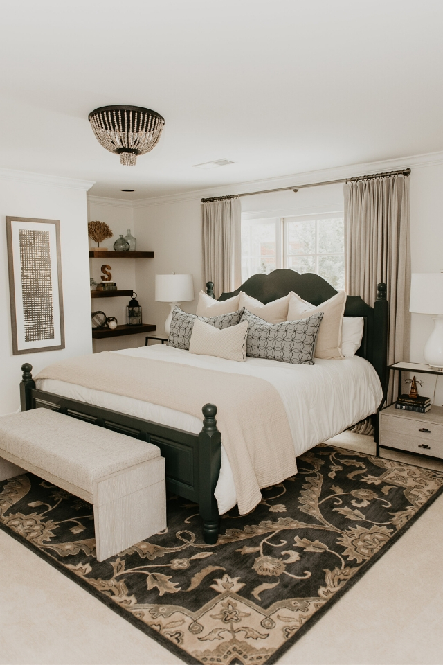 My artsy client decided to transform her kid’s former bedroom into a guest room. So, the red walls got a fresh coat of Benjamin Moore White Dove to flow with the rest of the upstairs. An old wooden bed received new life with a few coats of Benjamin Moore Navy Masterpiece, also painted on the walls in the adjoining bathroom. The bed’s custom bedding adds dimension and texture with a warm, welcoming feel. Floating walnut wood shelves were installed to allow use of the unique wall inset. The area rug, with its thick, luxurious pile, visually grounds the bed in the center of the room. We accessorized the nightstands and shelves with unique pieces that add character. Every detail was planned out to tie the space together with color, texture, and personality.