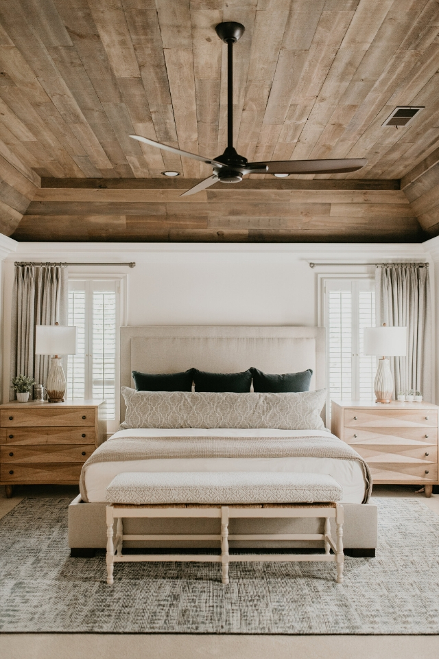 Before, the master bedroom felt outdated with green grasscloth wallpaper, floral window treatments, and old carpet. We painted the walls and trim in Benjamin Moore White Dove and installed a new, lighter carpet. But the showstopper in this room is the wood ceiling. The pinewood in a dark stain creates a gorgeous focal piece that draws the eye immediately upon entering the room. The white walls and light-colored carpet contrast dramatically with the rustic ceiling, which creates a cozy, encapsulating effect. A new, modern fan was installed to blend in with the ceiling. The custom bed with custom grand sham creates a statement that’s simple, yet beautiful. We also created a relaxing sitting area with custom leather recliners that face a dresser finished in the same wood tone as the ceiling. All of the neutrals and wood tones in this bedroom make the room feel cozy and fresh. Simple accessories keep the room feeling uncluttered. It’s the perfect retreat for a creative mind that needs to wind down.