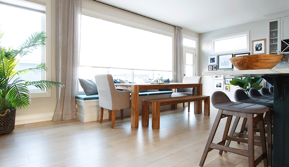 Flooring played a huge role in the dining room specifically. We ended up deciding to use hardwood flooring and insert it into the tray ceiling to create a real sense of earthy richness and give the room immediate interest. Because there was such a strong desire to have those natural elements (both from the mountains and coastal references), we thought this would be the perfect way to create an impact and set the stage as the formal dining room is right off the entrance.