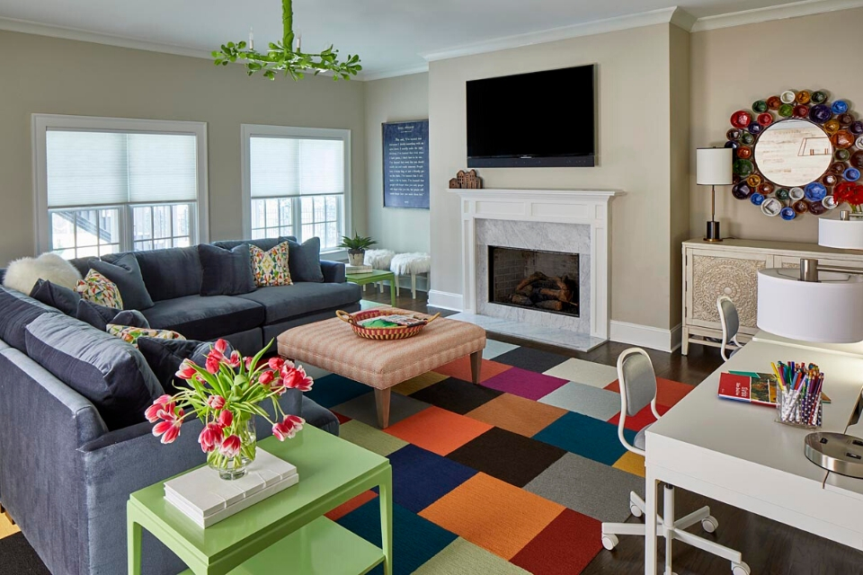 “The kids’ craft stations were the biggest hit. Ikea desks with great storage, good lighting with USB charging in the lamps, and oversized linen bulletin boards to display artwork made for great functionality. The Matisse quote on the wall was custom-painted by local artist/designer Kristen Fountain Davis. Adding to the functionality of the space was the modular rug, which consists of durable commercial-grade carpet tiles in a variety of colors.”