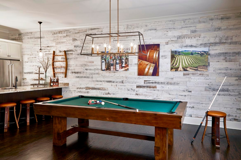 "The great design element in the pool area is the Stikwood wall—authentic reclaimed wood that is adhered to the walls, giving us that instant wine cellar feel. We then added statement lighting, and custom art depicting wine cellars as well as an American flag made out of bottle caps.”
