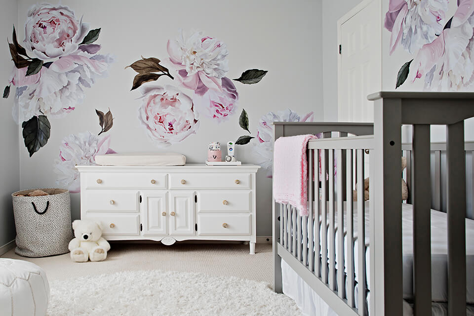 Peony decals transform this Iced Cubed Silver bedroom from a boy’s nursery into a girly space.