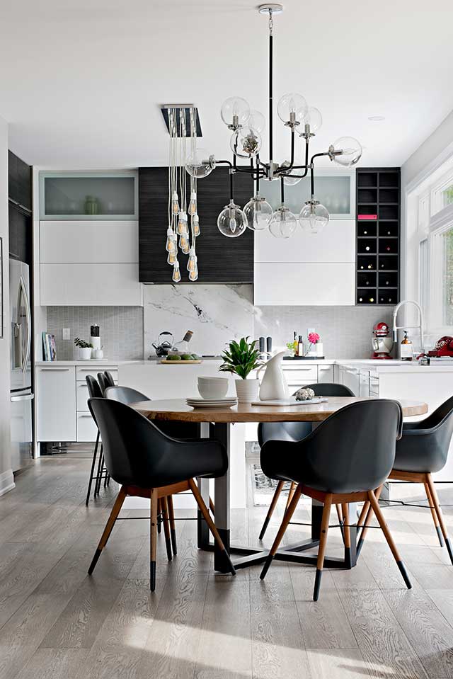 Color-blocking ebony wood tones creates a dynamic effect. A custom light fixture takes center stage over the island.